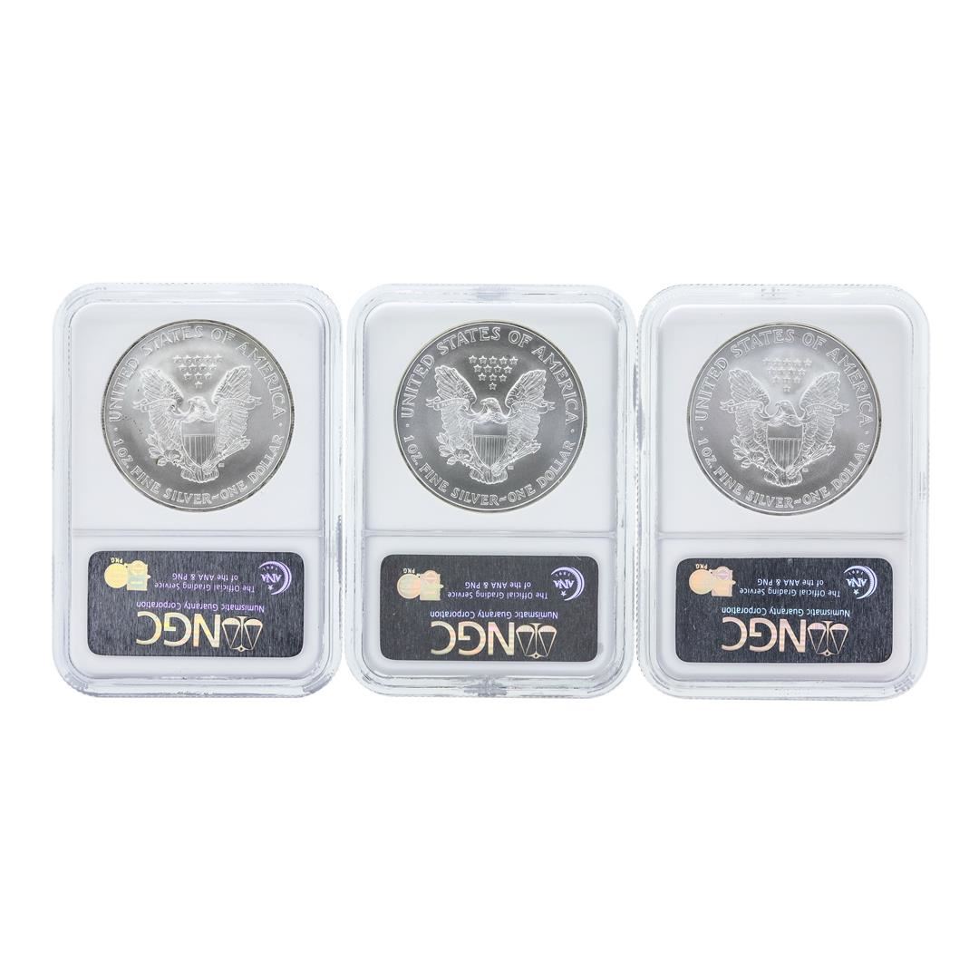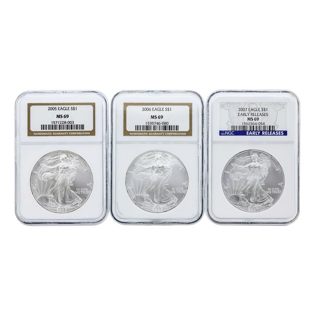 One Lot of (3) 2005-2007 $1 American Silver Eagle Coins NGC MS69. NGC Certified.