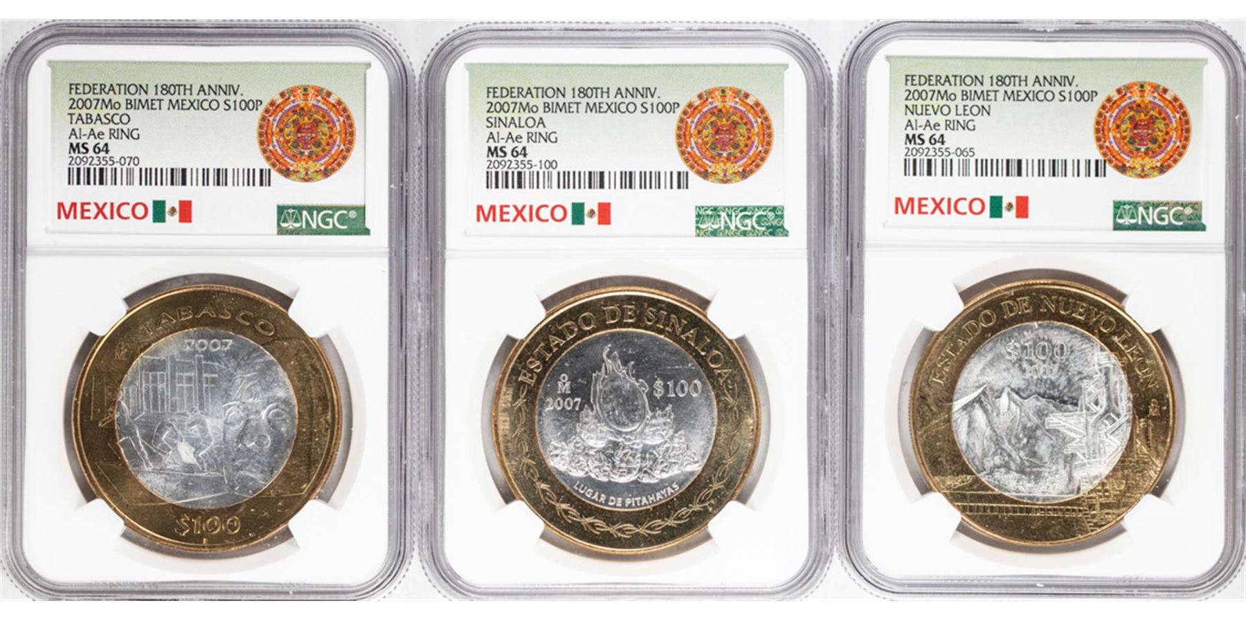 One Lot of (3) 2007Mo Mexico 180th Anniversary 100 Pesos Silver Coins NGC MS64. NGC Certified.