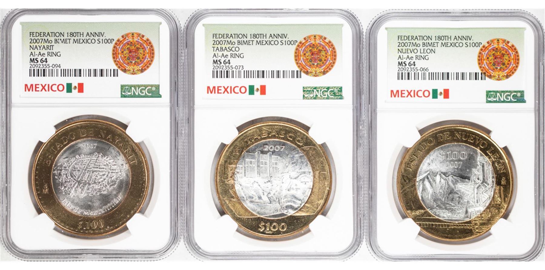 One Lot of (3) 2007Mo Mexico 180th Anniversary 100 Pesos Silver Coins NGC MS64. NGC Certified.