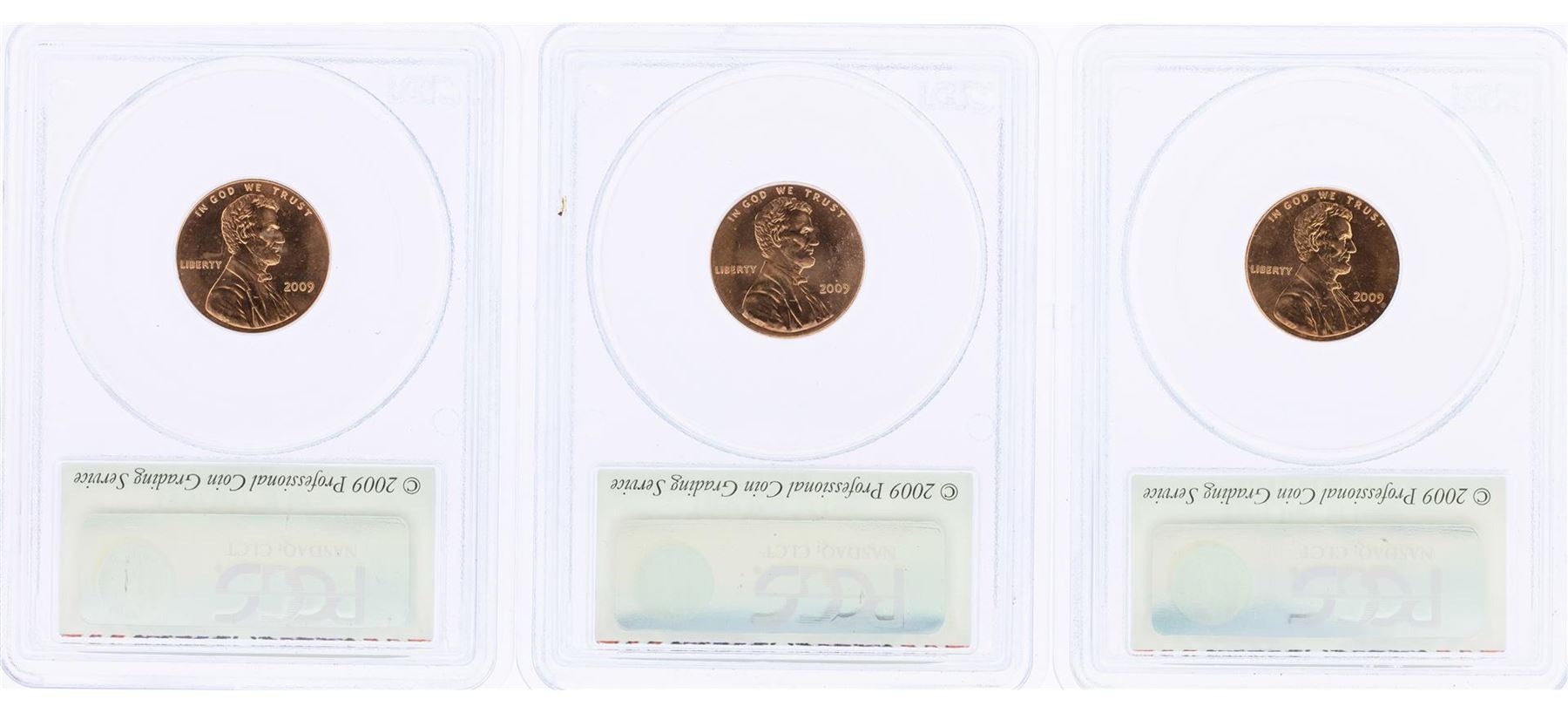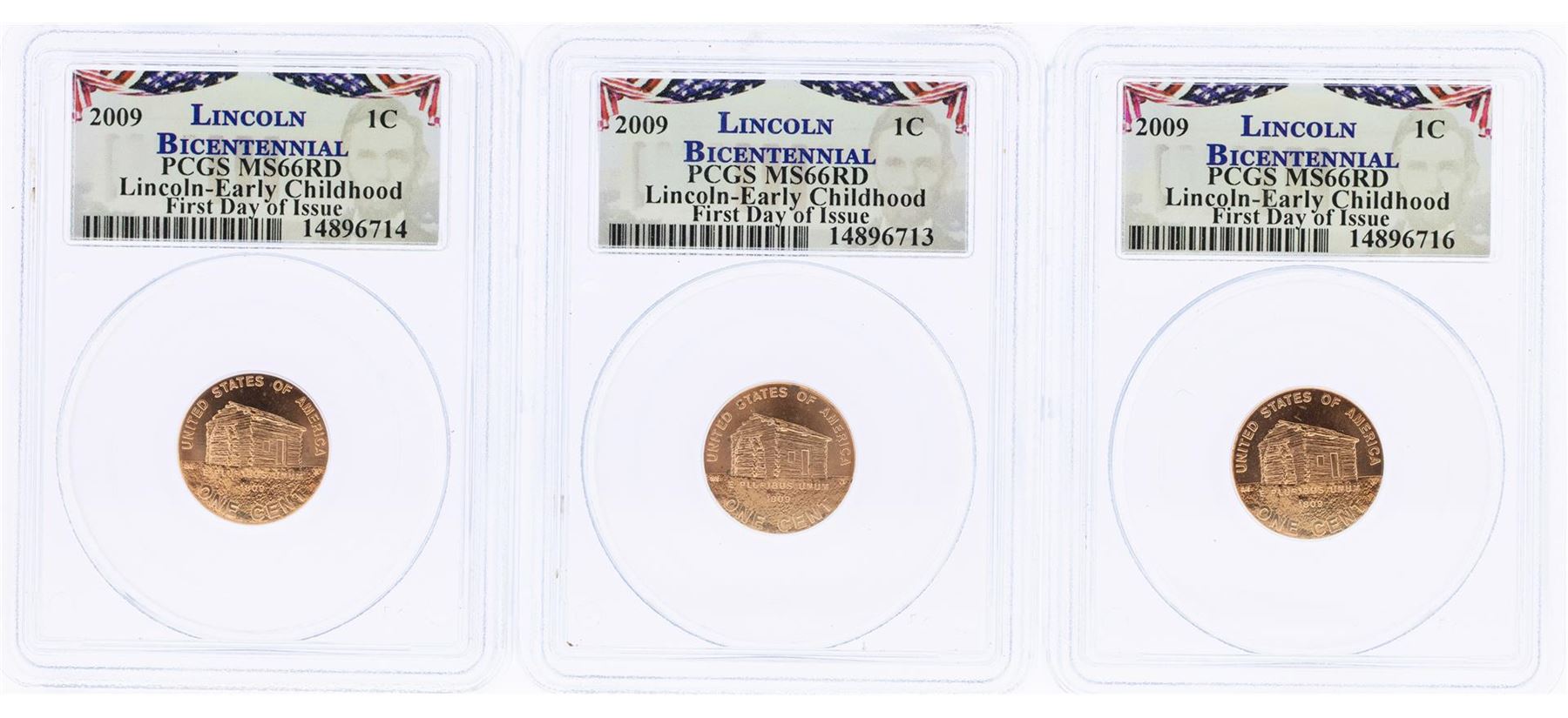 One Lot of (3) 2009 Bicentennial Lincoln Cent Coins PCGS MS66RD First Day of Issue. PCGS Graded.