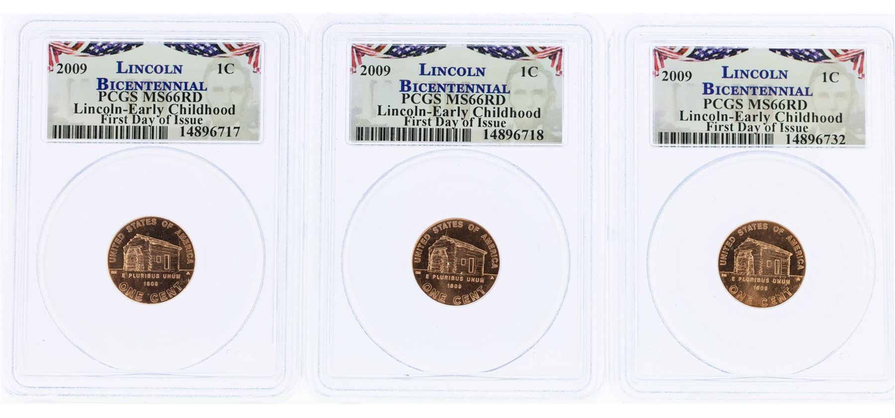 One Lot of (3) 2009 Bicentennial Lincoln Cent Coins PCGS MS66RD First Day of Issue. PCGS Graded.