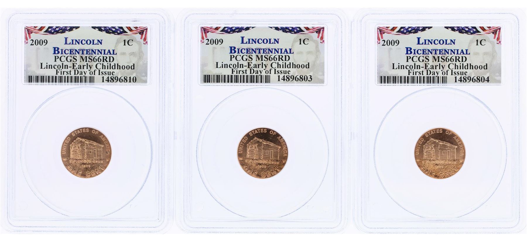 One Lot of (3) 2009 Bicentennial Lincoln Cent Coins PCGS MS66RD First Day of Issue. PCGS Graded.