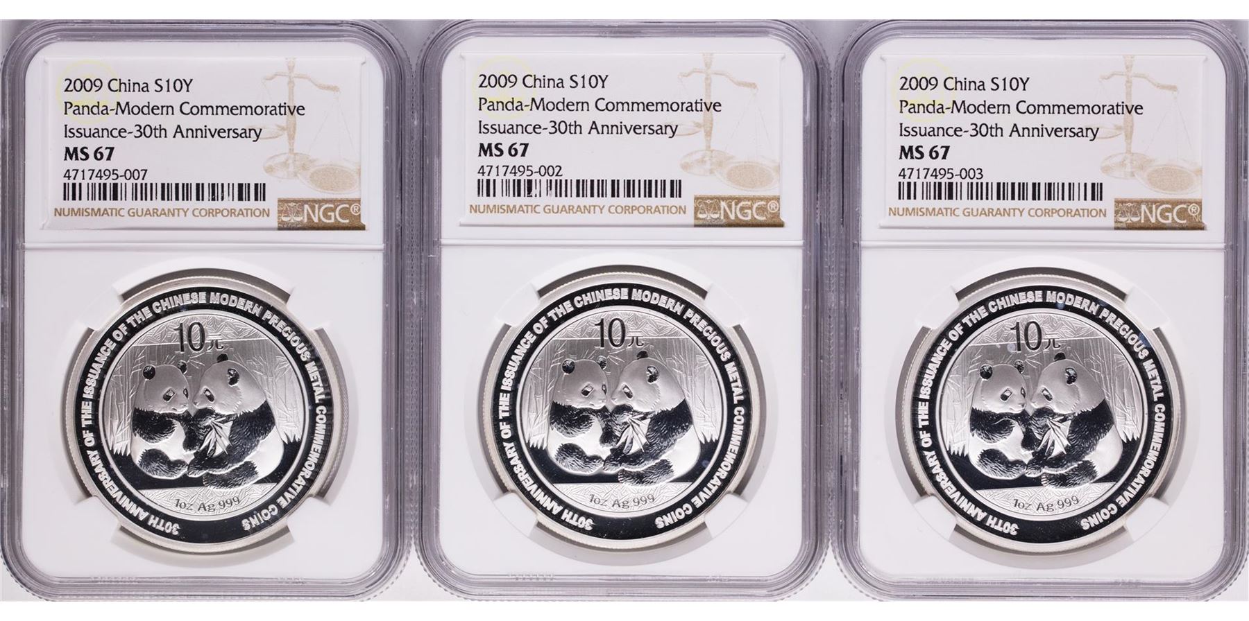 One Lot of (3) 2009 China 10 Yuan Modern Commemorative Silver Panda Coins NGC MS67. NGC Certified.