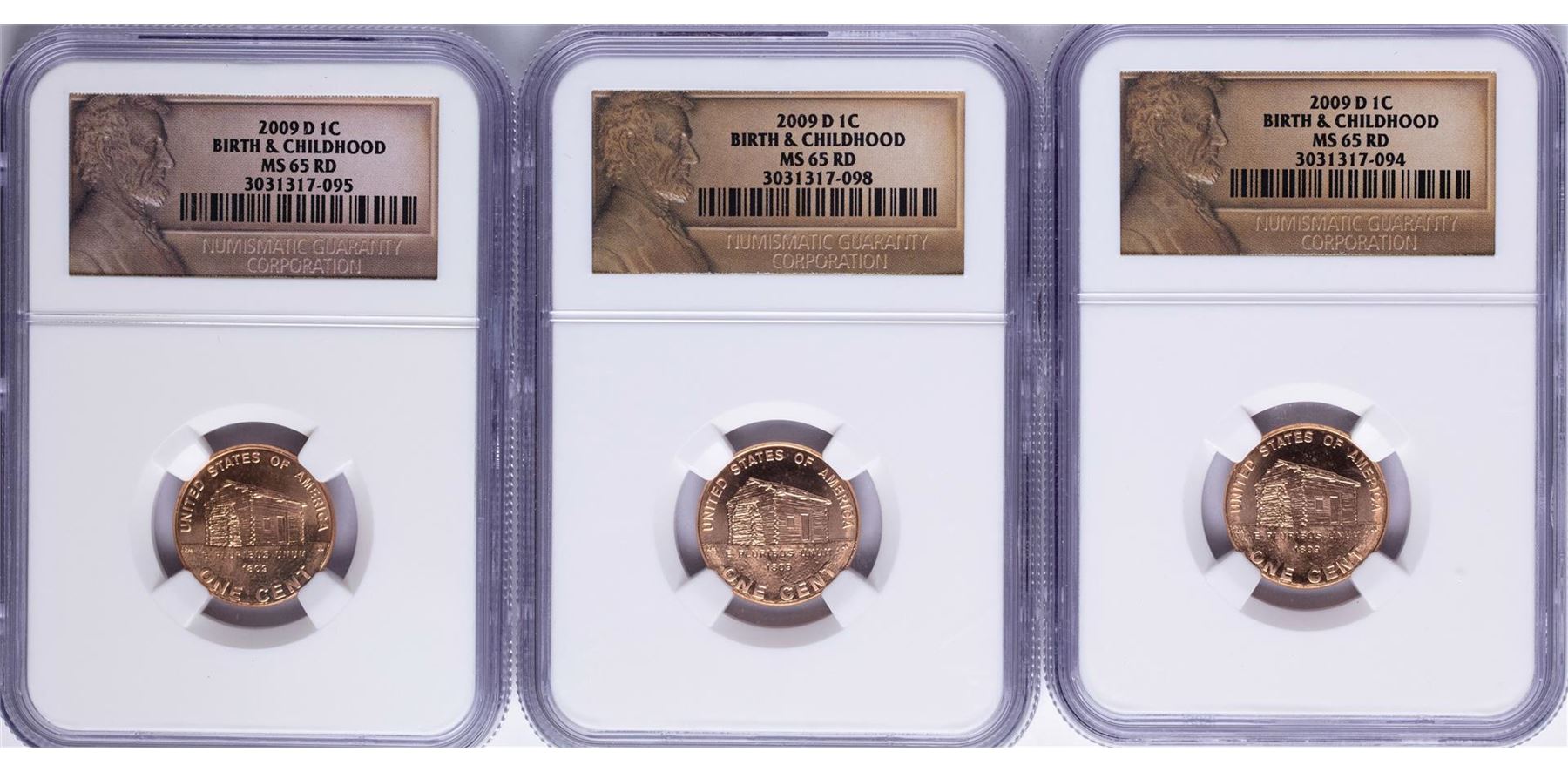 Lot of (3) 2009-D Birth & Childhood Lincoln Cent Coins PCGS MS65RD