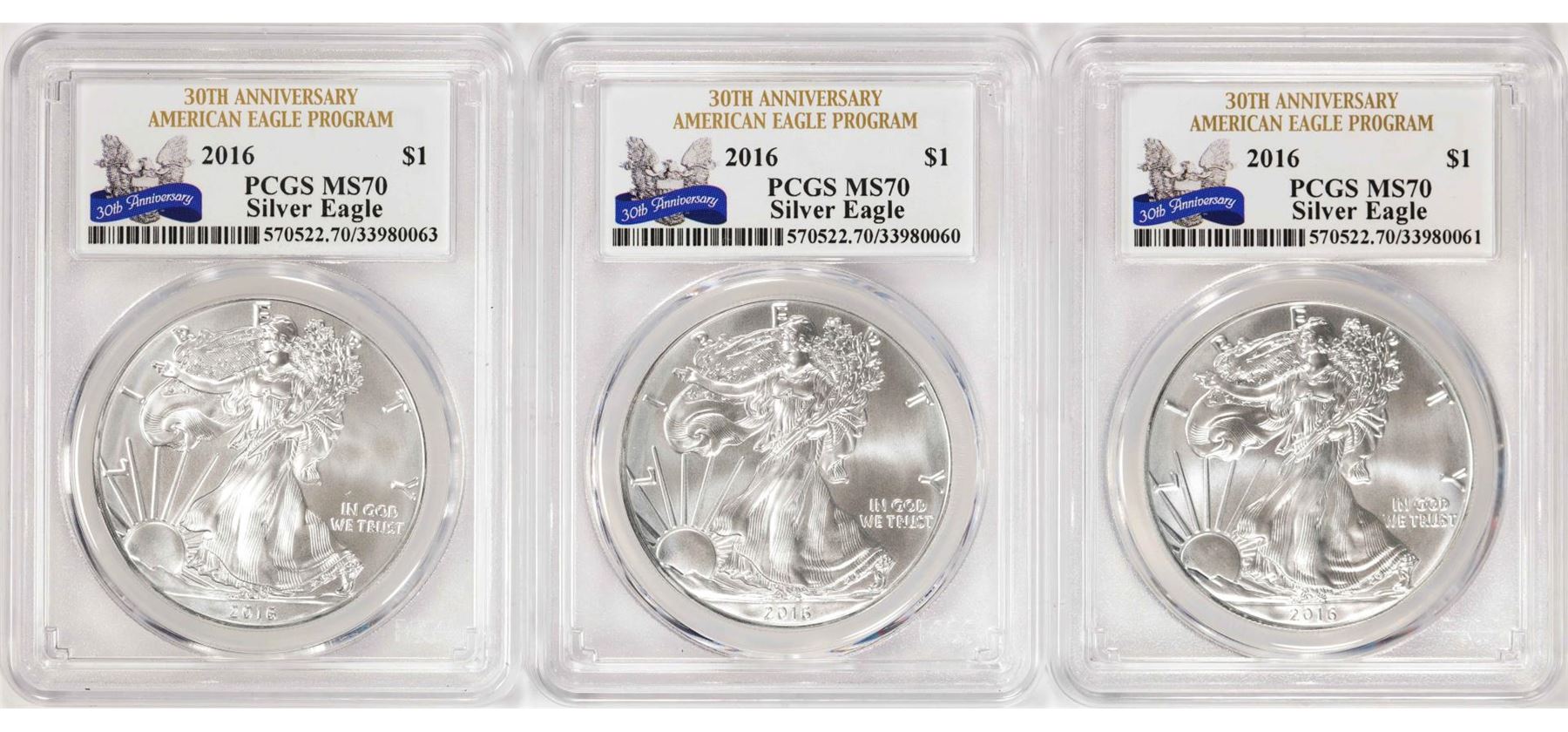 Lot of (3) 2016 $1 American Silver Eagle Coins PCGS MS70
