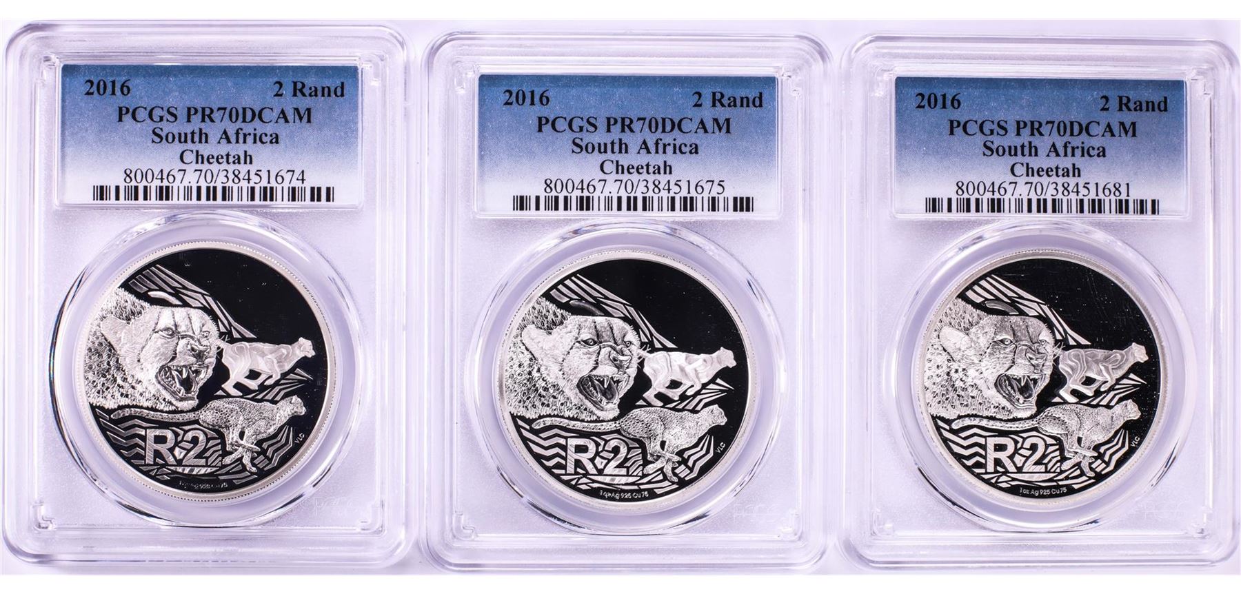 One Lot of (3) 2016 Proof South Africa 2 Rand Cheetah Silver Coins PCGS PR70DCAM. PCGS Graded.