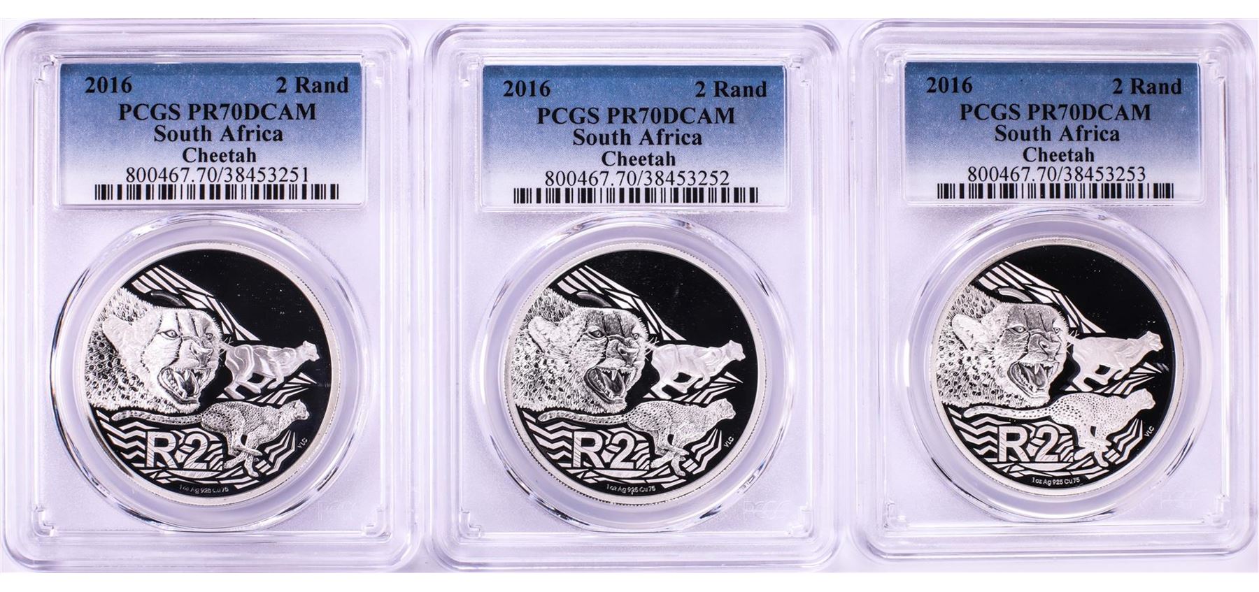 One Lot of (3) 2016 Proof South Africa 2 Rand Cheetah Silver Coins PCGS PR70DCAM. PCGS Graded.