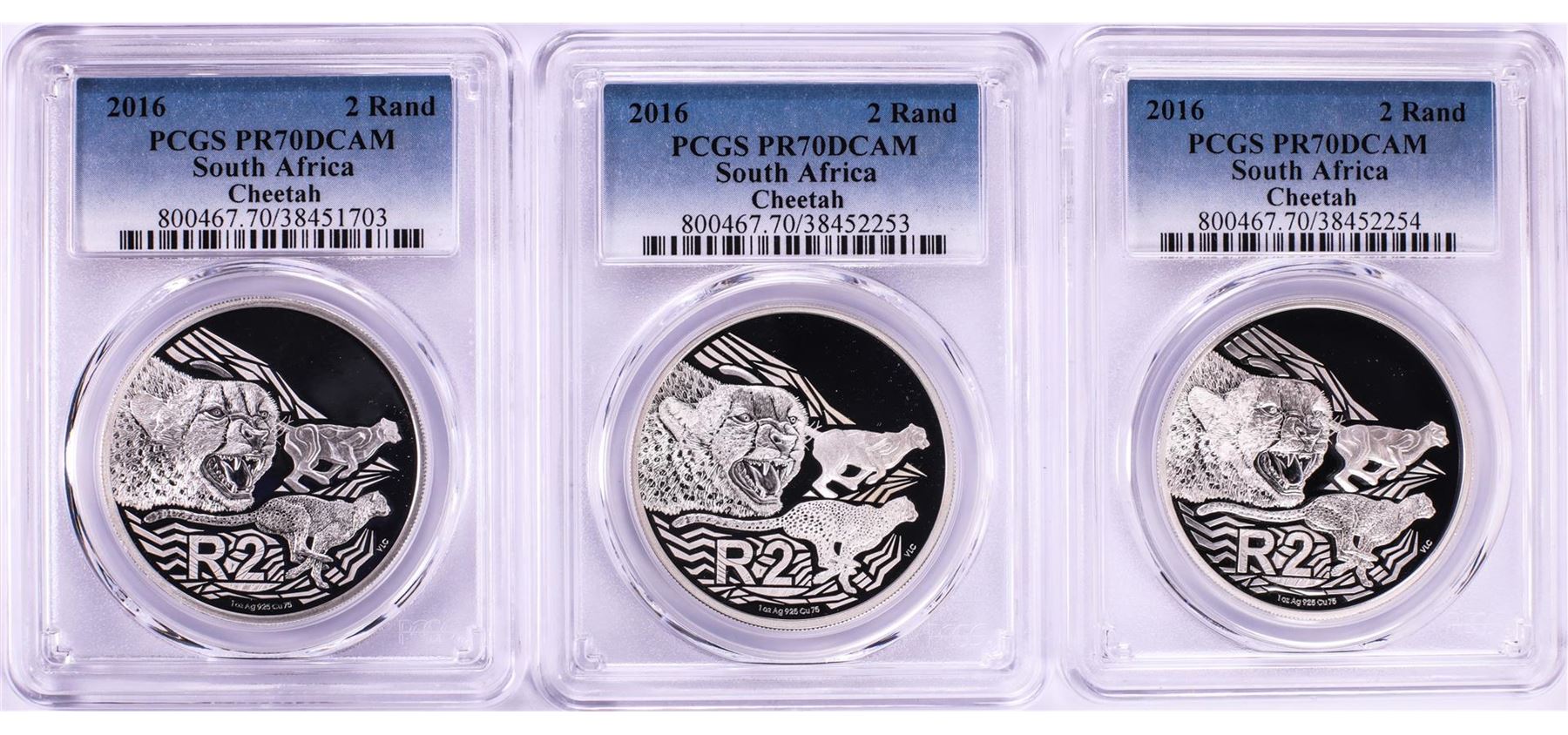 One Lot of (3) 2016 Proof South Africa 2 Rand Cheetah Silver Coins PCGS PR70DCAM. PCGS Graded.