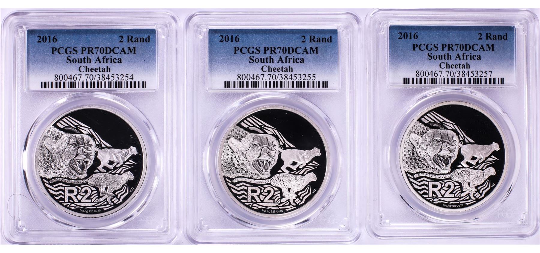 One Lot of (3) 2016 Proof South Africa 2 Rand Cheetah Silver Coins PCGS PR70DCAM. PCGS Graded.