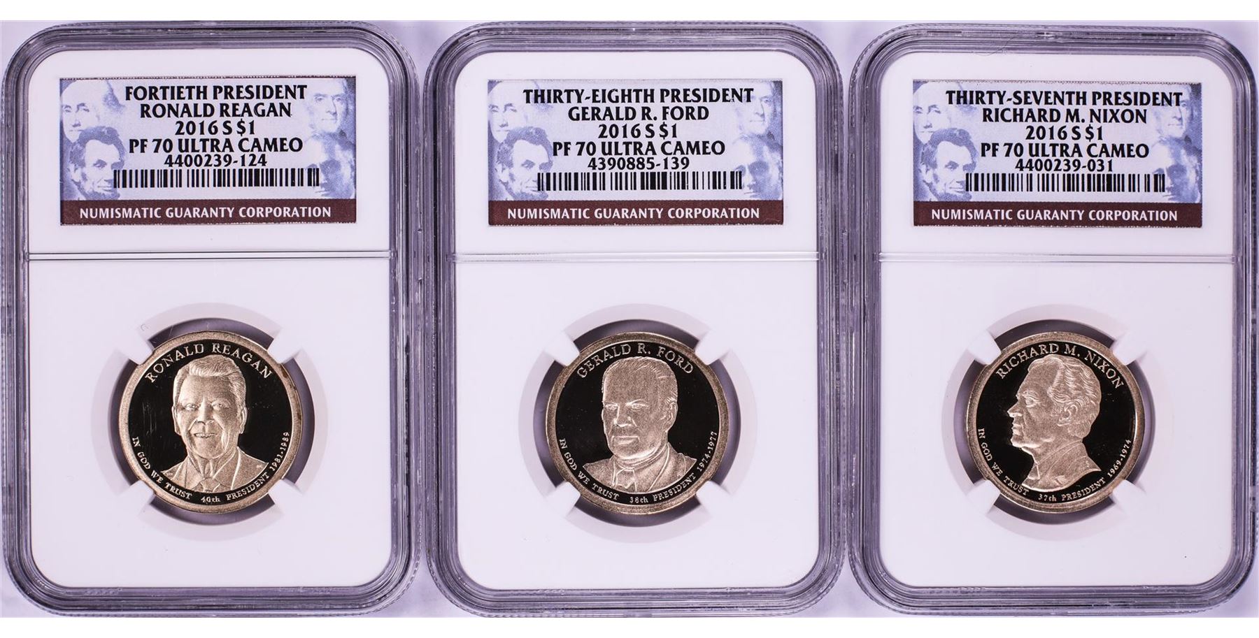 One Lot of (3) 2016-S $1 Proof Presidential Dollar Coins NGC PF70 Ultra Cameo. NGC Certified.