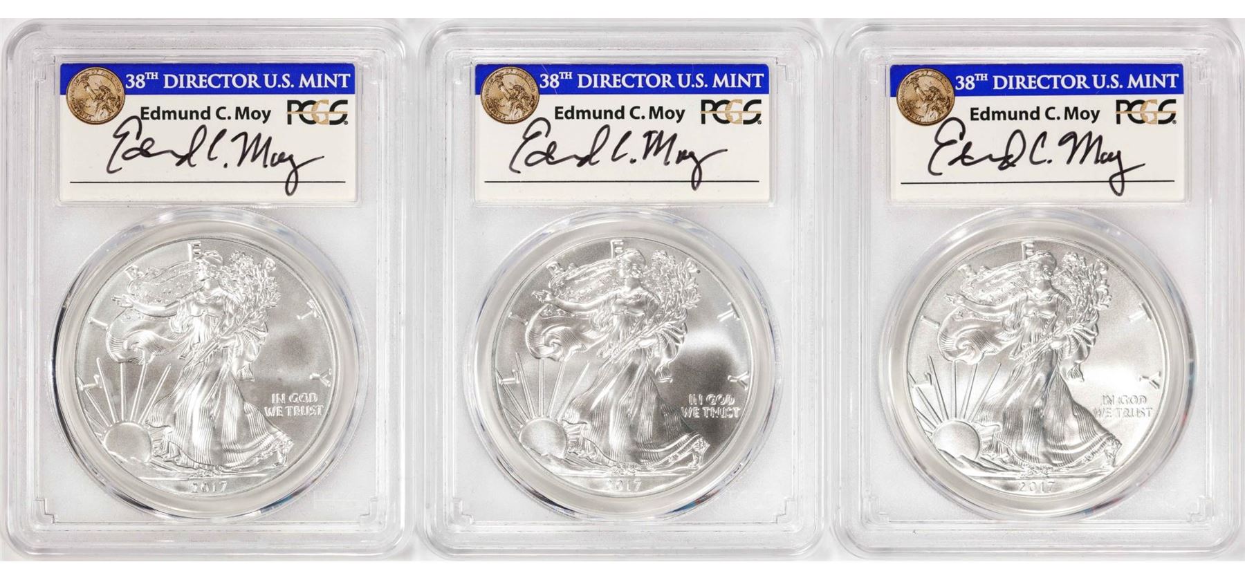 One Lot of (3) 2017 $1 American Silver Eagle Coins PCGS MS70 Edmund Moy Signature FS. PCGS Graded.