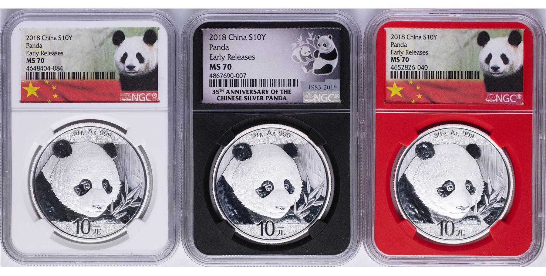 One Lot of (3) 2018 China Panda Silver Coins NGC MS70 Early Releases. NGC Certified.