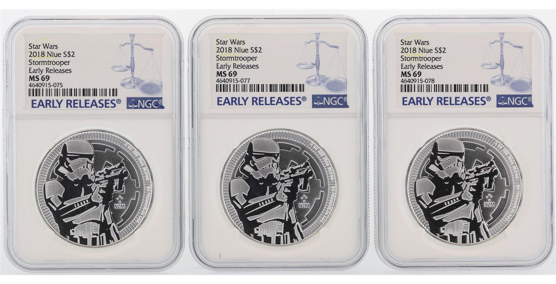 One Lot of (3) 2018 Niue $2 Star Wars Stormtrooper Silver Coins NGC MS69 Early Releases. NGC Certified.