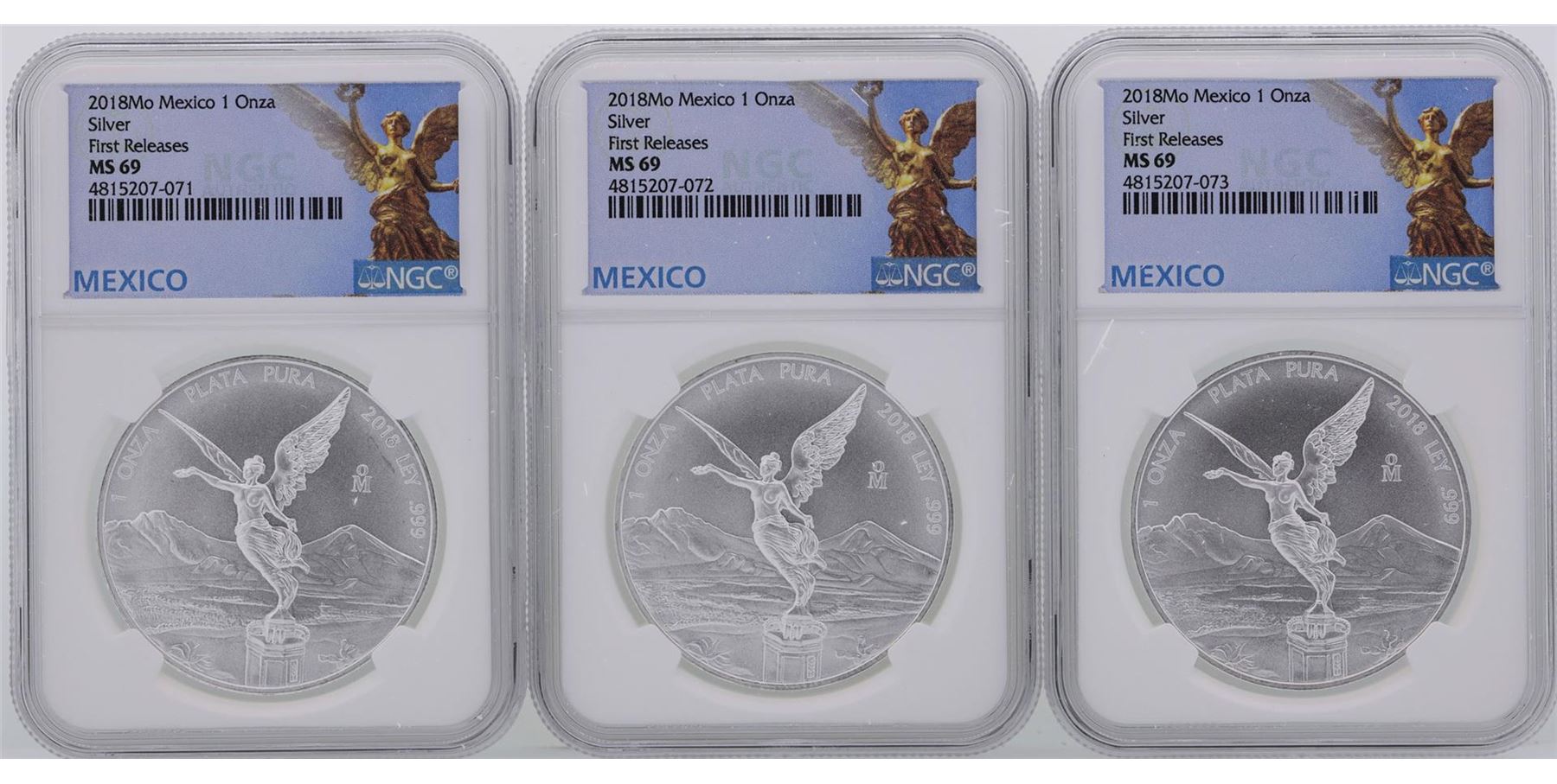 Lot of (3) 2018MO Mexico 1 Oz First Releases Silver Coins NGC MS69