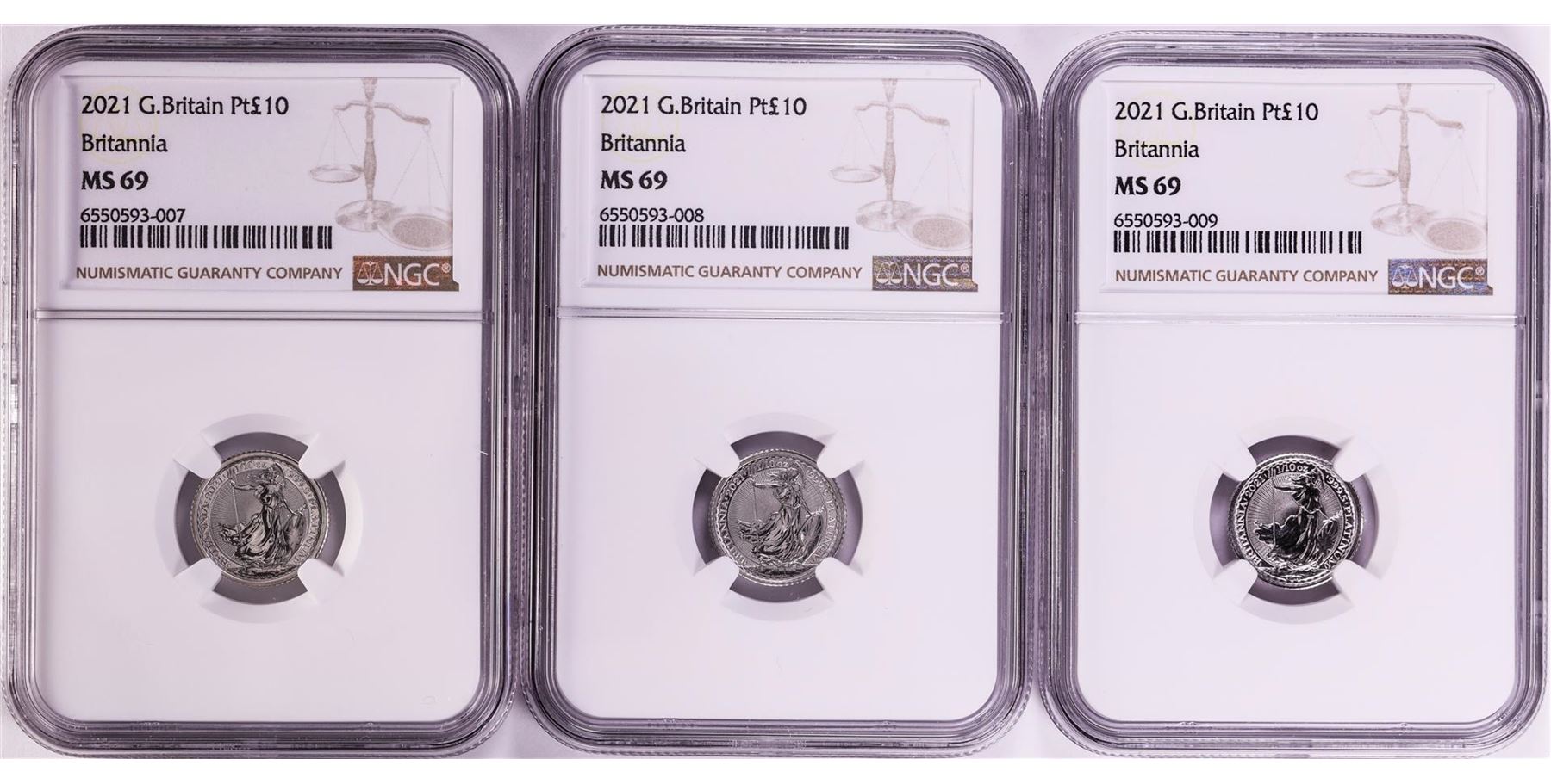 One Lot of (3) 2021 Great Britain 10 Pounds Britannia 1/10oz Platinum Coins NGC MS69. NGC Certified.