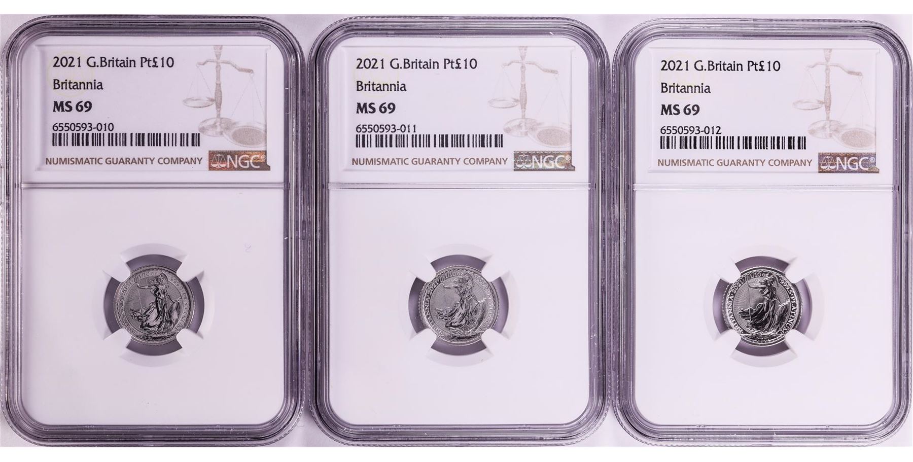 One Lot of (3) 2021 Great Britain 10 Pounds Britannia 1/10oz Platinum Coins NGC MS69. NGC Certified.