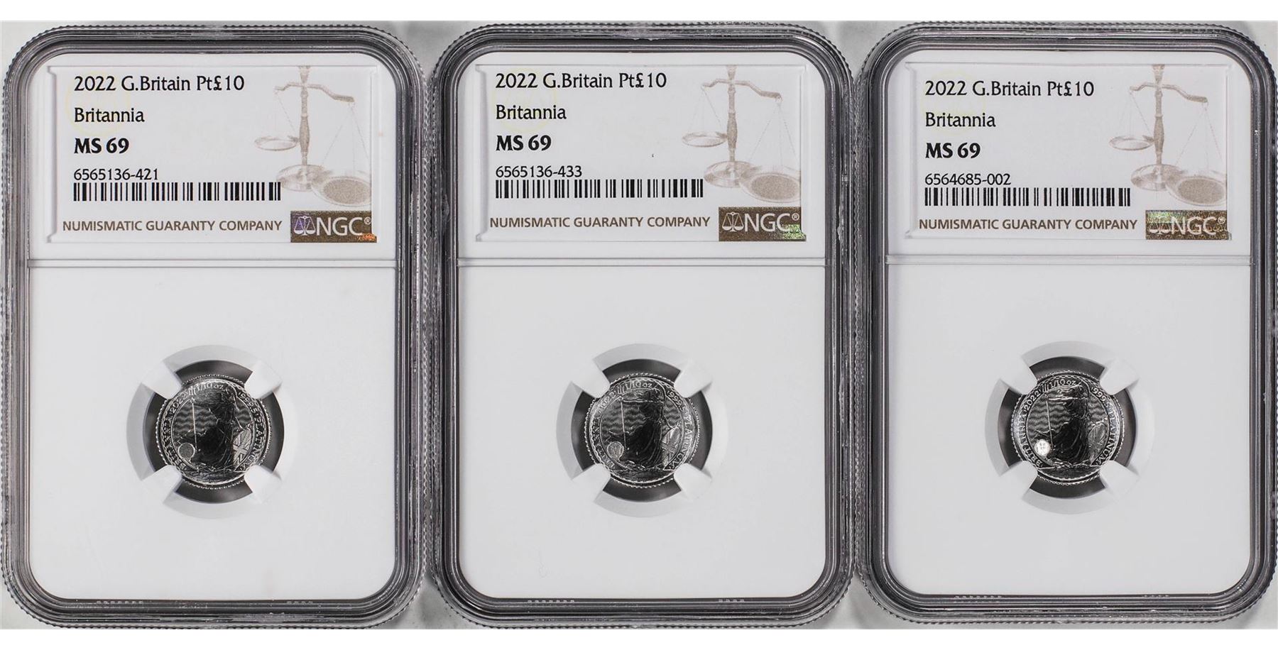 Lot of (3) 2022 Great Britain 10 Pounds Britannia 1/10oz Platinum Coins NGC MS69