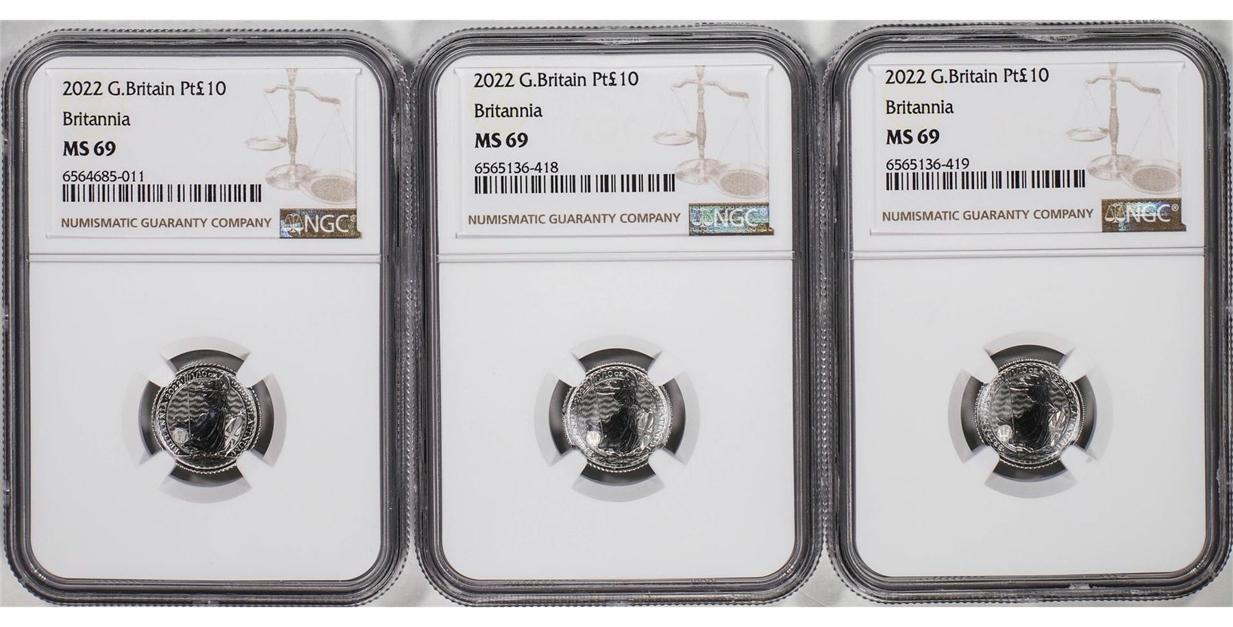One Lot of (3) 2022 Great Britain 10 Pounds Britannia 1/10oz Platinum Coins NGC MS69. NGC Certified.
