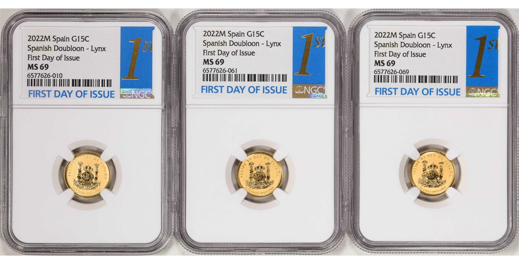 One Lot of (3) 2022M Spain 15 Euro Cent Lynx Gold Doubloon Coins NGC MS69 FDOI. NGC Certified.