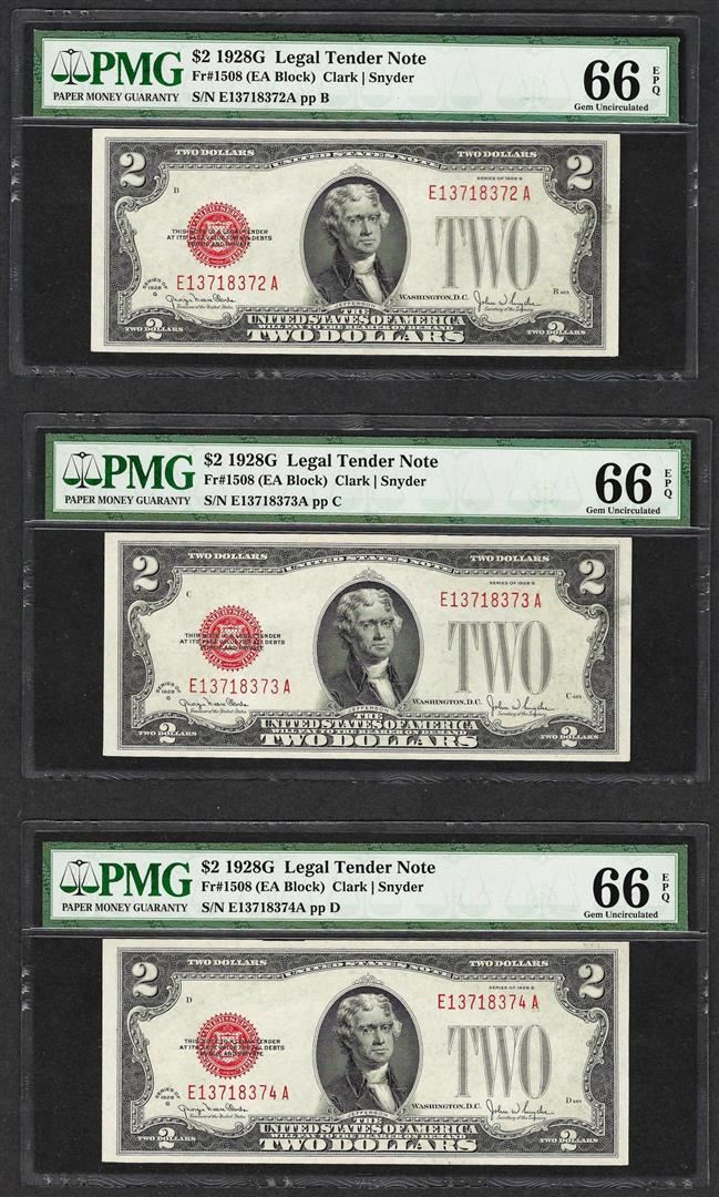 One Lot of (3) Consecutive 1928G $2 Legal Tender Notes Fr.1508 PMG Gem Uncirculated 66EPQ. PMG Certified.