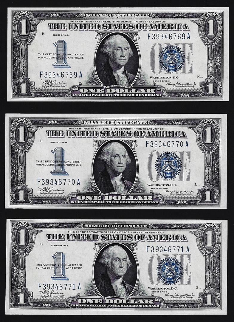One Lot of (3) Consecutive 1934 $1 Silver Certificate Notes.