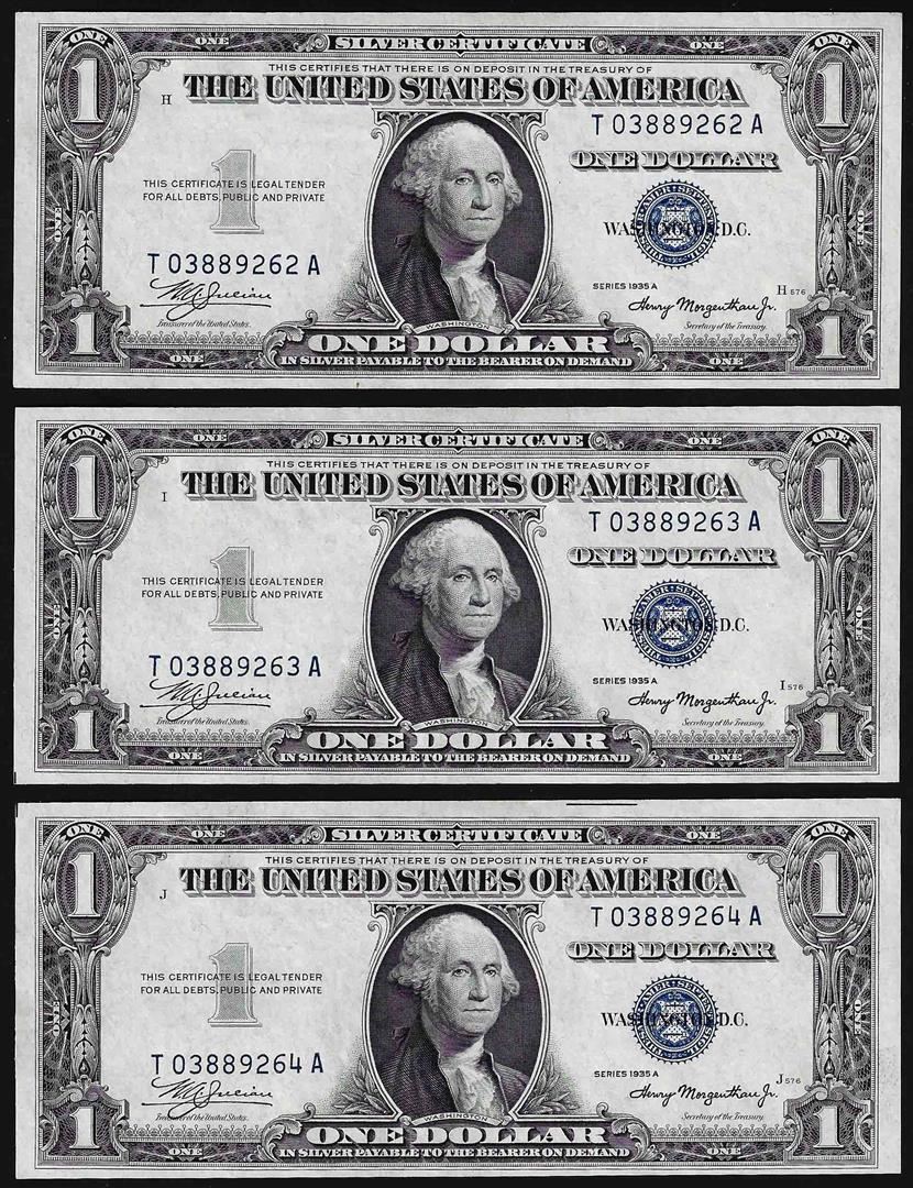 One Lot of (3) Consecutive 1935A $1 Silver Certificate Notes Uncirculated.