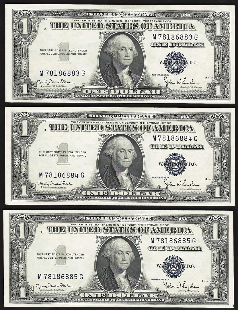 Lot of (3) Consecutive 1935D $1 Silver Certificate Notes Narrow Uncirculated