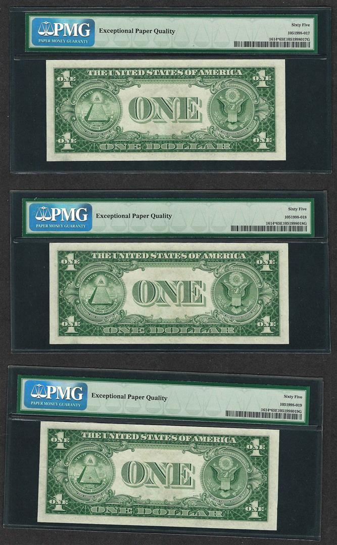 One Lot of (3) Consecutive 1935E $1 Silver Certificate STAR Notes PMG Gem Unc. 65EPQ. PMG Certified.