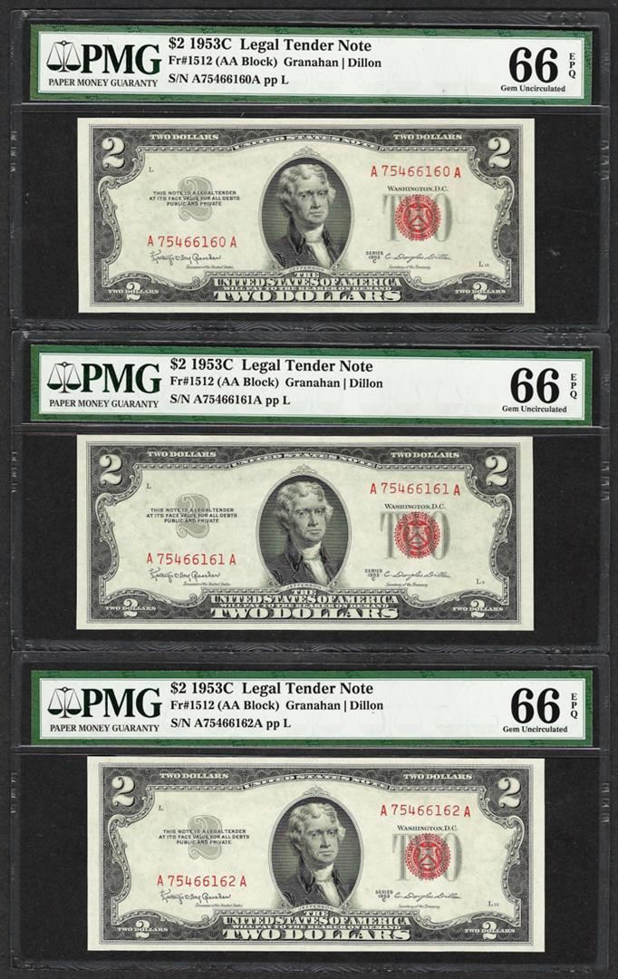 One Lot of (3) Consecutive 1953C $2 Legal Tender Notes Fr.1512 PMG Gem Uncirculated 66EPQ. PMG Certified.