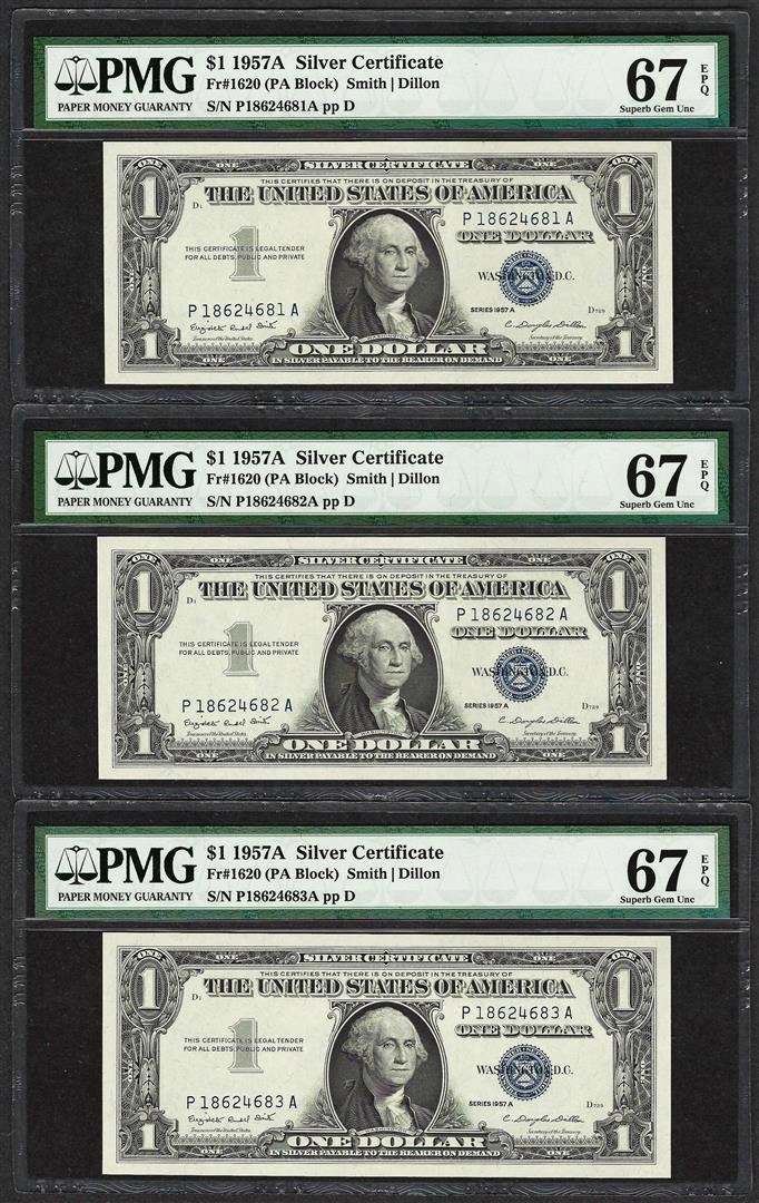 One Lot of (3) Consecutive 1957A $1 Silver Certificate Notes PMG Superb Gem Unc. 67EPQ. PMG Certified.