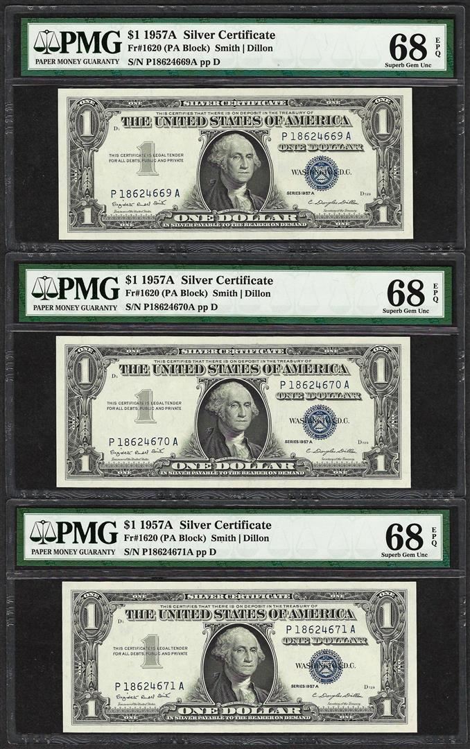 One Lot of (3) Consecutive 1957A $1 Silver Certificate Notes PMG Superb Gem Unc. 68EPQ. PMG Certified.