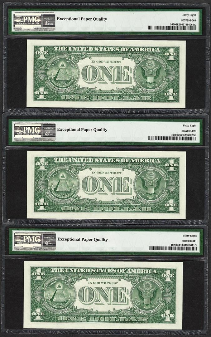 One Lot of (3) Consecutive 1957A $1 Silver Certificate Notes PMG Superb Gem Unc. 68EPQ. PMG Certified.