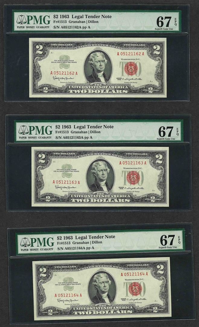 One Lot of (3) Consecutive 1963 $2 Legal Tender Notes PMG Superb Gem Uncirculated 67EPQ. PMG Certified.