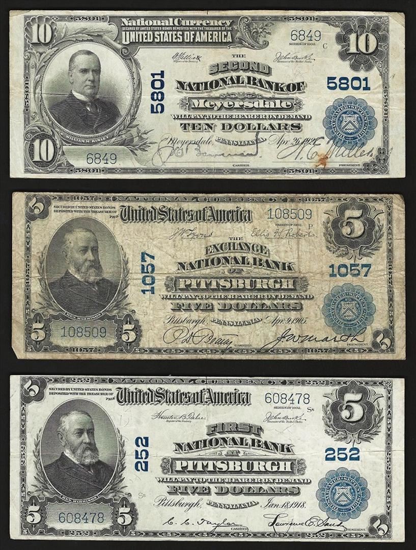 Lot of (3) Large Size Pennsylvania National Bank Notes. This lot contains the following notes: (1) 1921 $10 Second National Bank of Meyersdale Note, (1) 1905 $5 Exchange National Bank of Pittsburgh Note, and (1) 1918 $5 First National Bank of Pittsburgh Note.