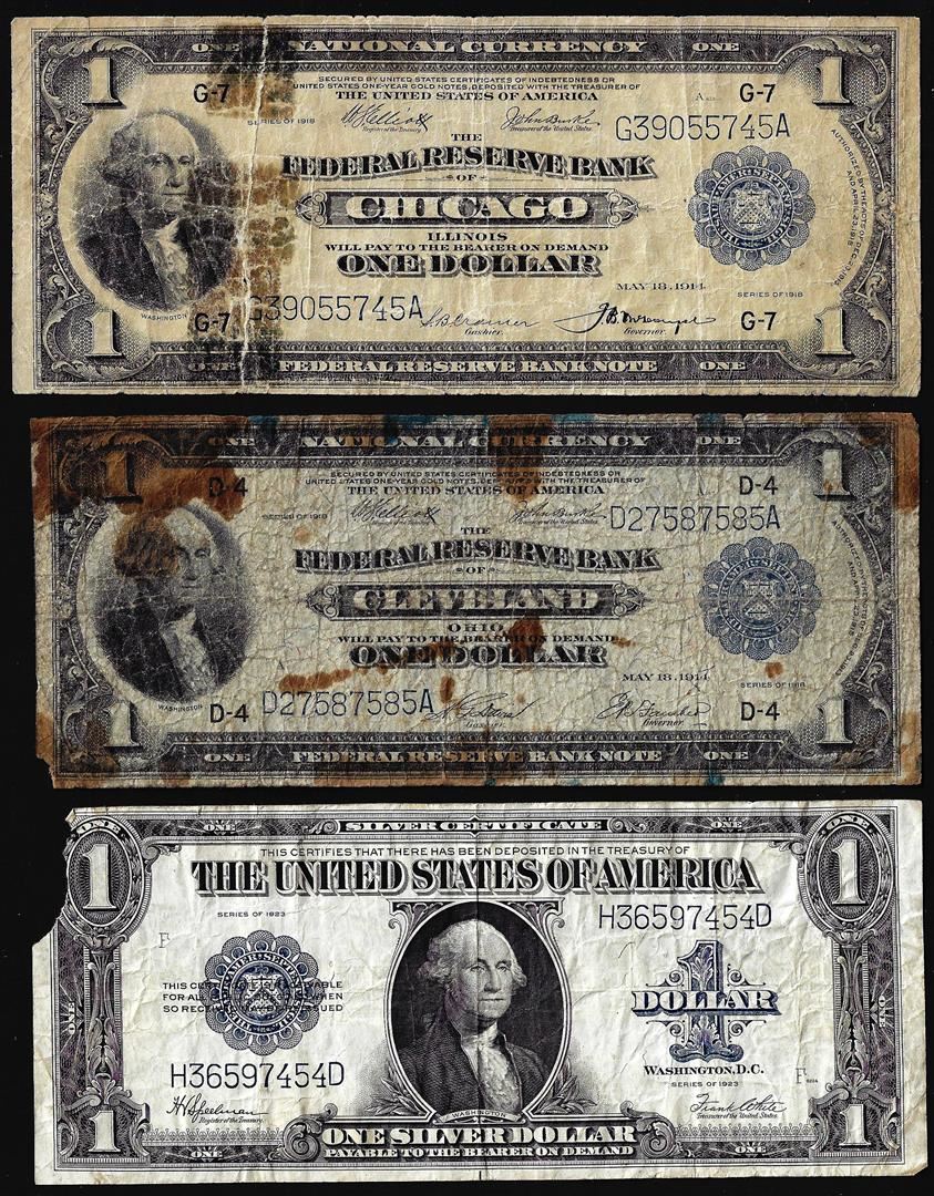 Lot of (3) Large Size U.S. $1 Federal Reserve and Silver Certificate Notes