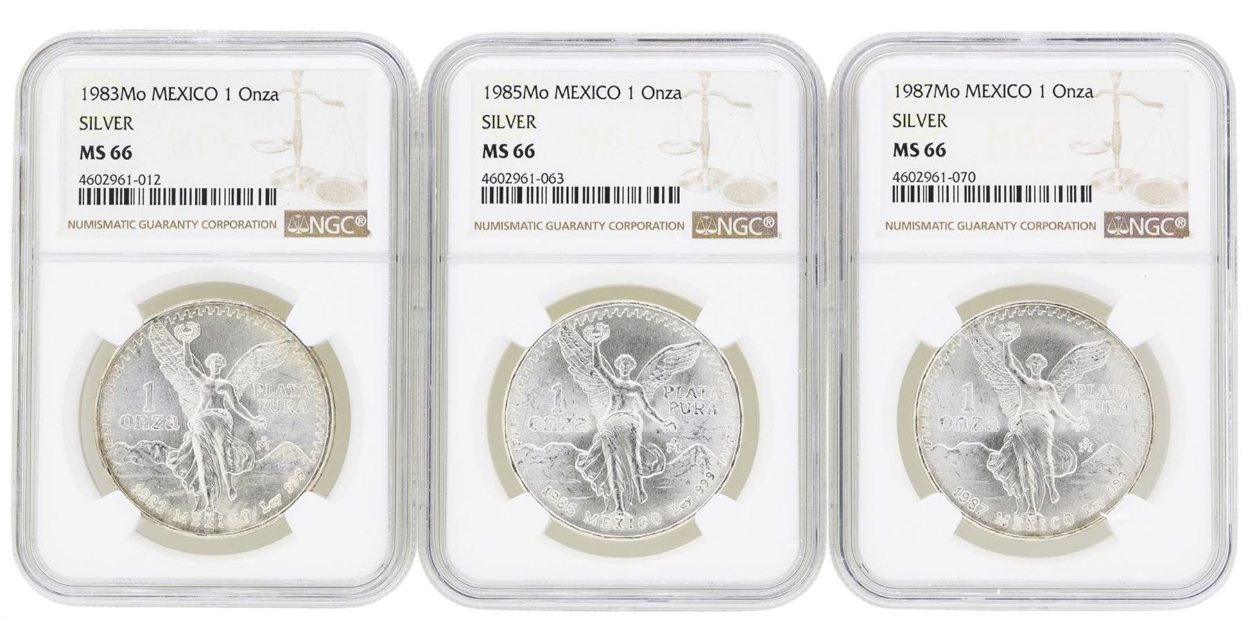 One Lot of (3) Mexico 1 Onza Silver Libertad Coins NGC MS66. NGC Certified.