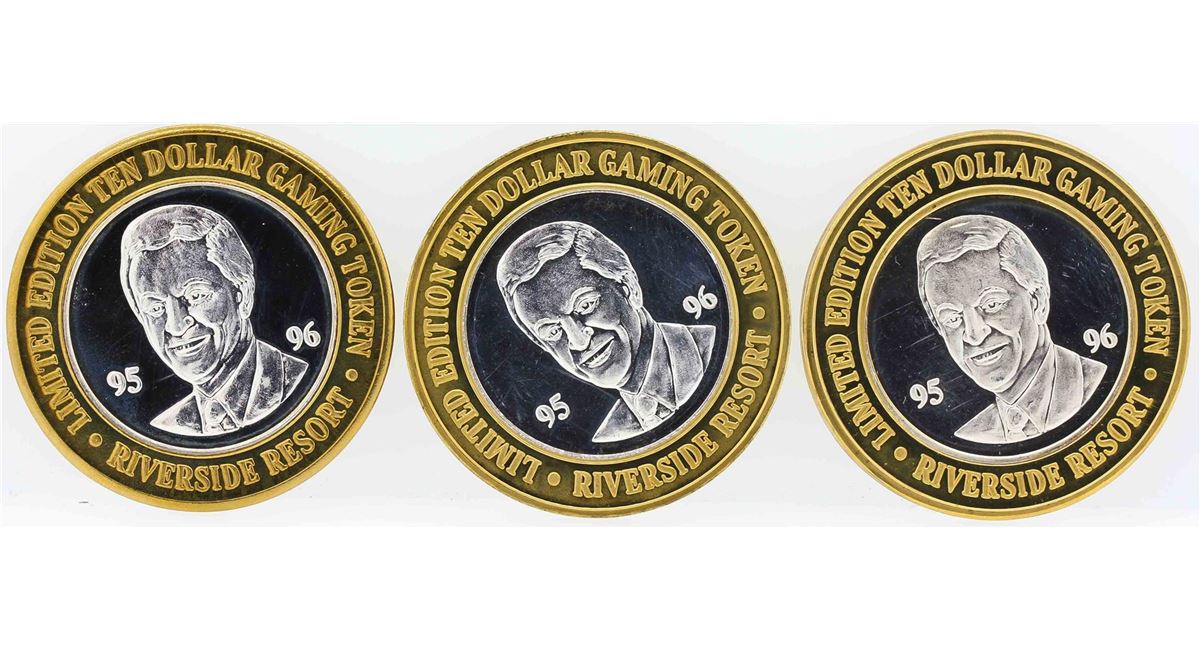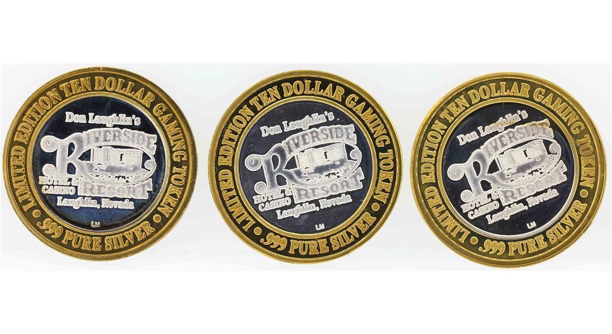 One Lot of (3) Riverside Resort Laughlin $10 Casino Gaming Token .999 Fine Silver Limited Edition.
