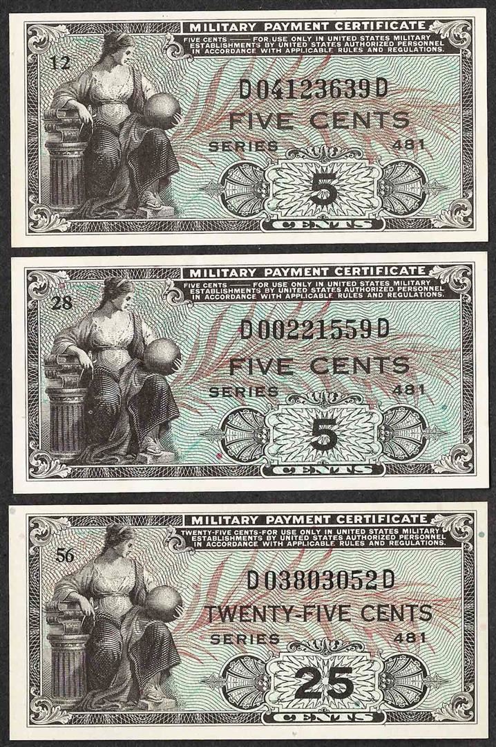 Lot of (3) Series 481 Military Payment Certificate Notes Uncirculated