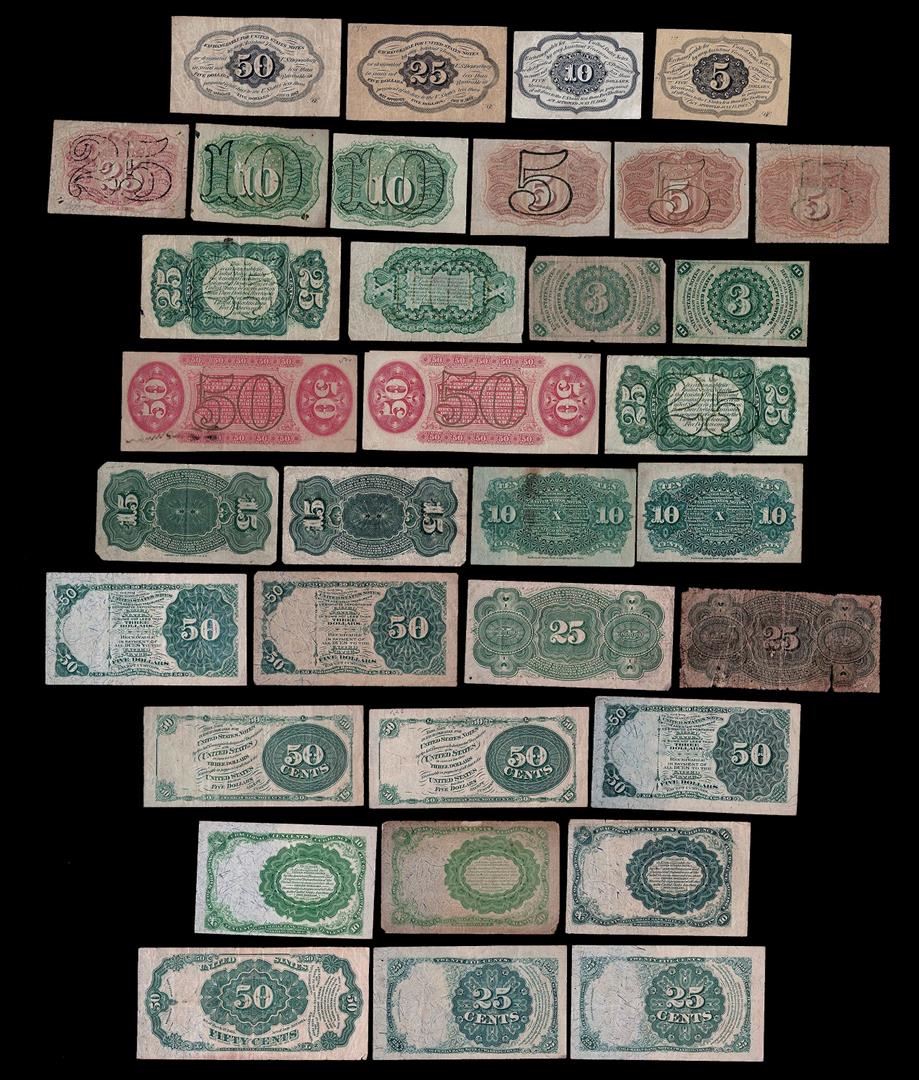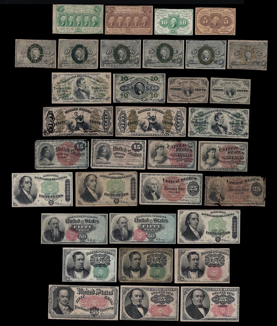 This lot of 35 Fractional Currency Notes includes the following items: First Issue- (1) 5 Cent, (1) 10 Cent, (1) 25 Cent, and (1) 50 Cent Fractional. Second Issue- (3) 5 Cent, (2) 10 Cent, and (1) 25 Cent Fractional. Third Issue- (2) 3 Cent, (1) 10 Cent, (2) 25 Cent, and (2) 50 Cent Fractionals. Fourth Issue- (2) 10 Cent, (2) 15 Cent, (2) 25 Cent, (4) 50 Cent Design 1379, and (2) 50 Cent Design 1376 Fractional Notes. Fifth Issue- (3) 10 Cent, (2) 25 Cent, and (1) 50 Cent Fractional Notes.