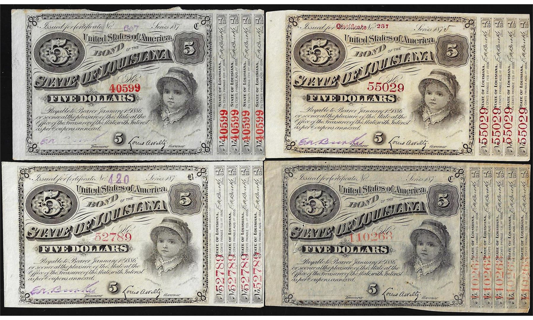 One Lot of (4) 1870's $5 State of Louisiana Baby Bond Notes.