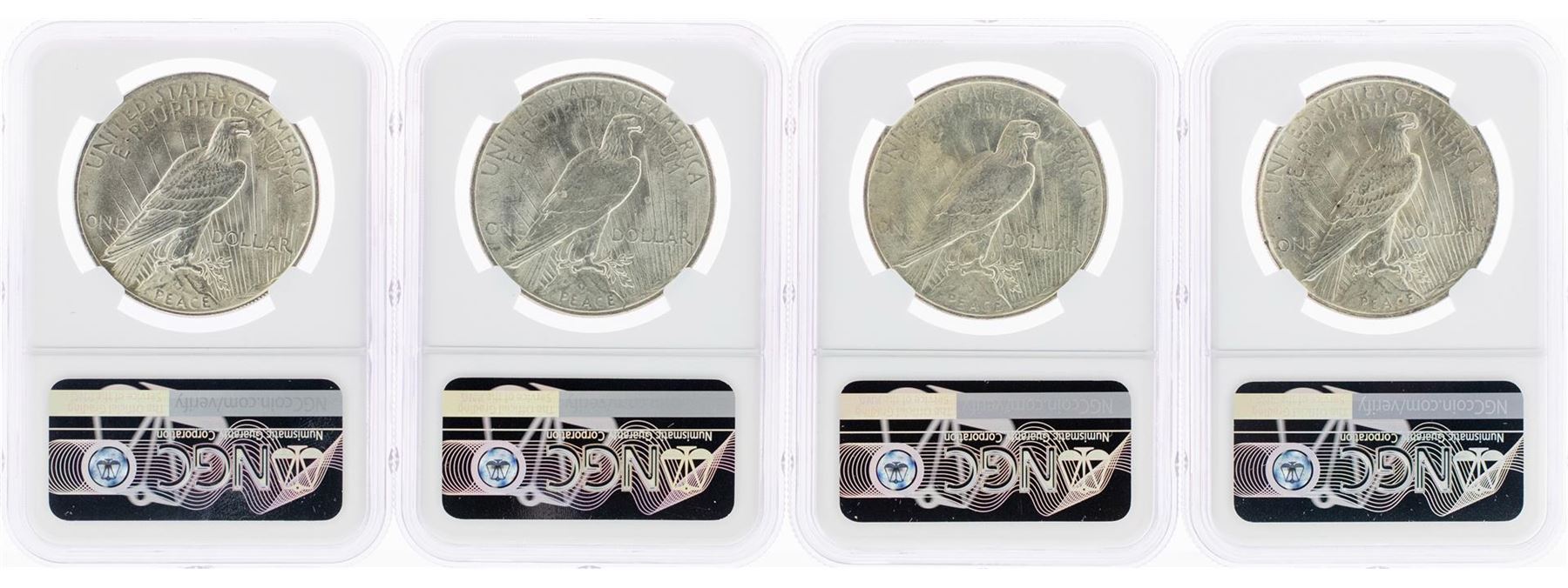 One Lot of (4) 1923 $1 Peace Silver Dollar Coins NGC MS63. NGC Certified.