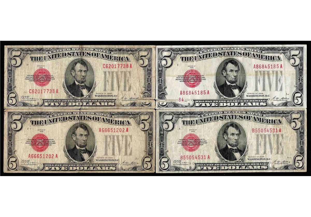 One Lot of (4) 1928 $5 Legal Tender Notes.