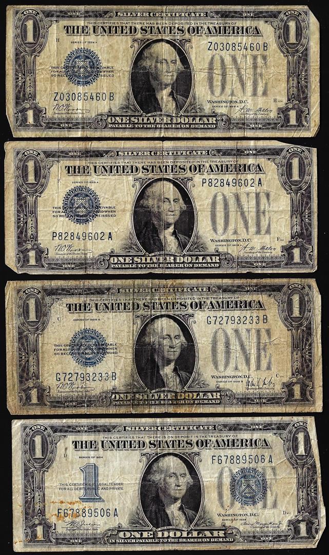 One Lot of (4) 1928A/1928B/1934 $1 Funnyback Silver Certificate Notes.