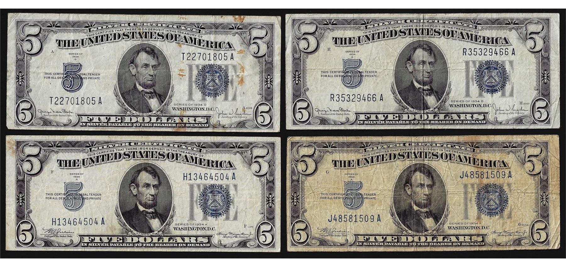 One Lot of (4) 1934 $5 Silver Certificate Notes.