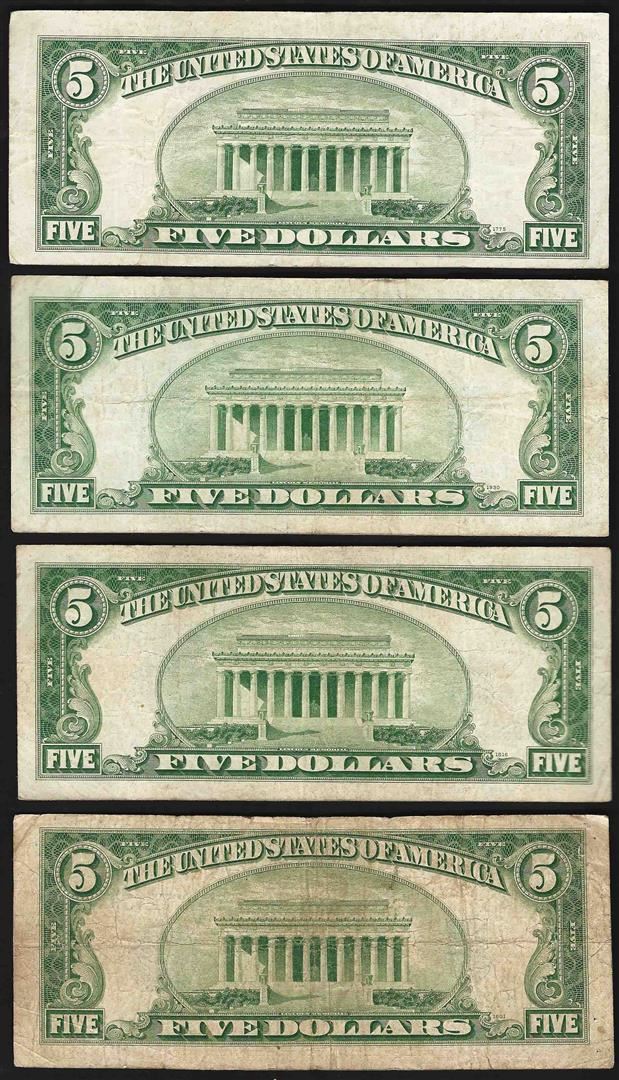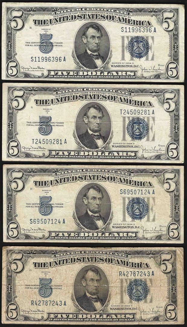 One Lot of (4) 1934D $5 Silver Certificate Notes.