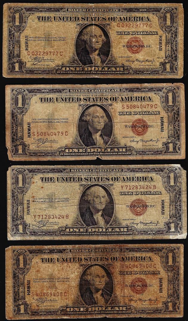 One Lot of (4) 1935A $1 Hawaii WWII Emergency Issue Silver Certificate Notes.