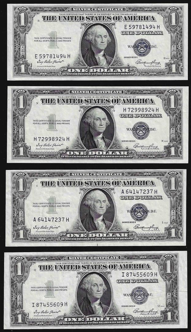 One Lot of (4) 1935E $1 Silver Certificate Notes Choice Uncirculated.