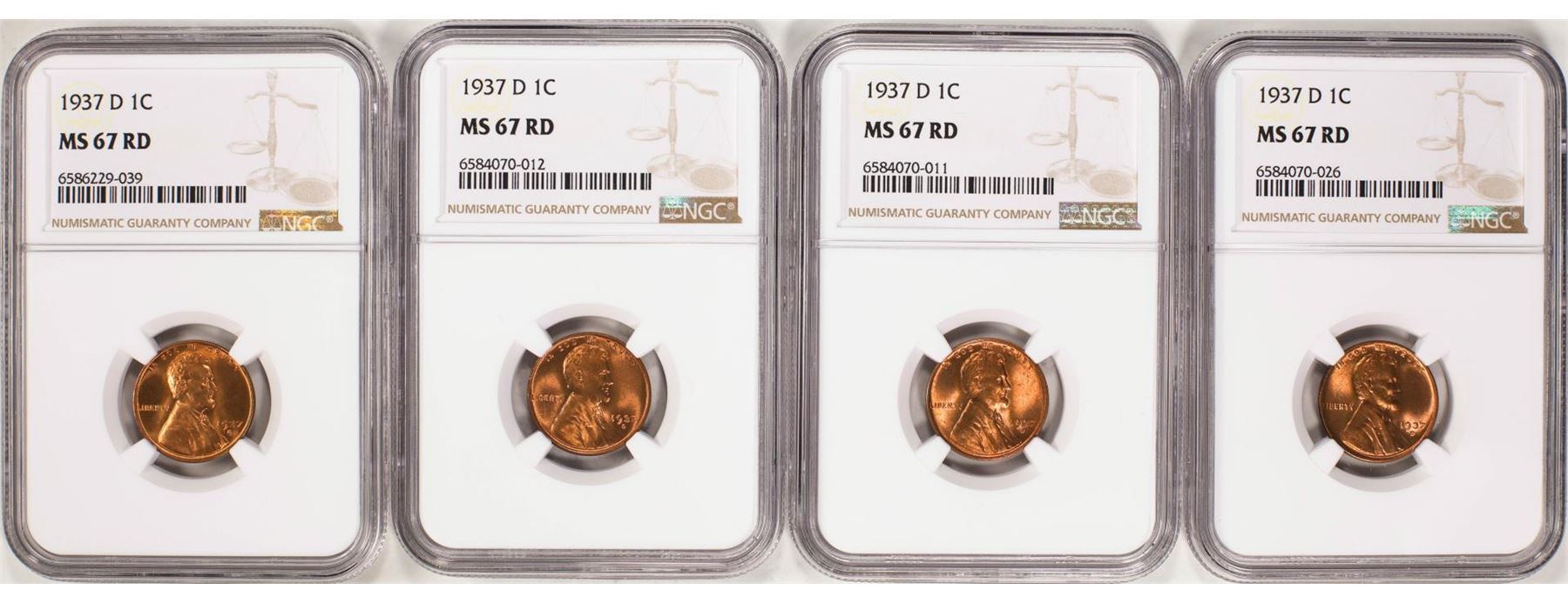 One Lot of (4) 1937-D Lincoln Wheat Cent Coins NGC MS67RD. NGC Certified.