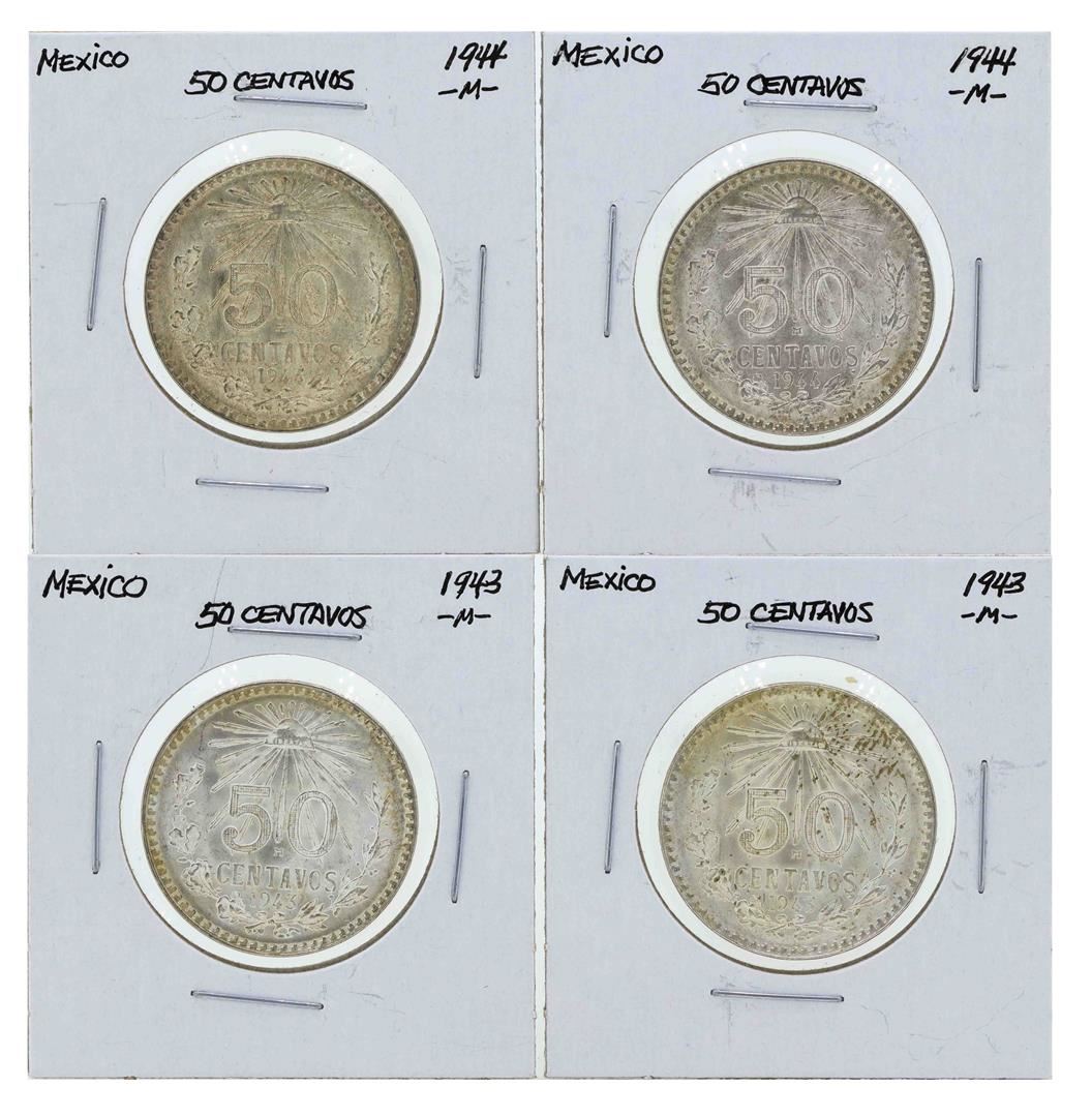 One Lot of (4) 1943-1944M Mexico 50 Centavos Coins.