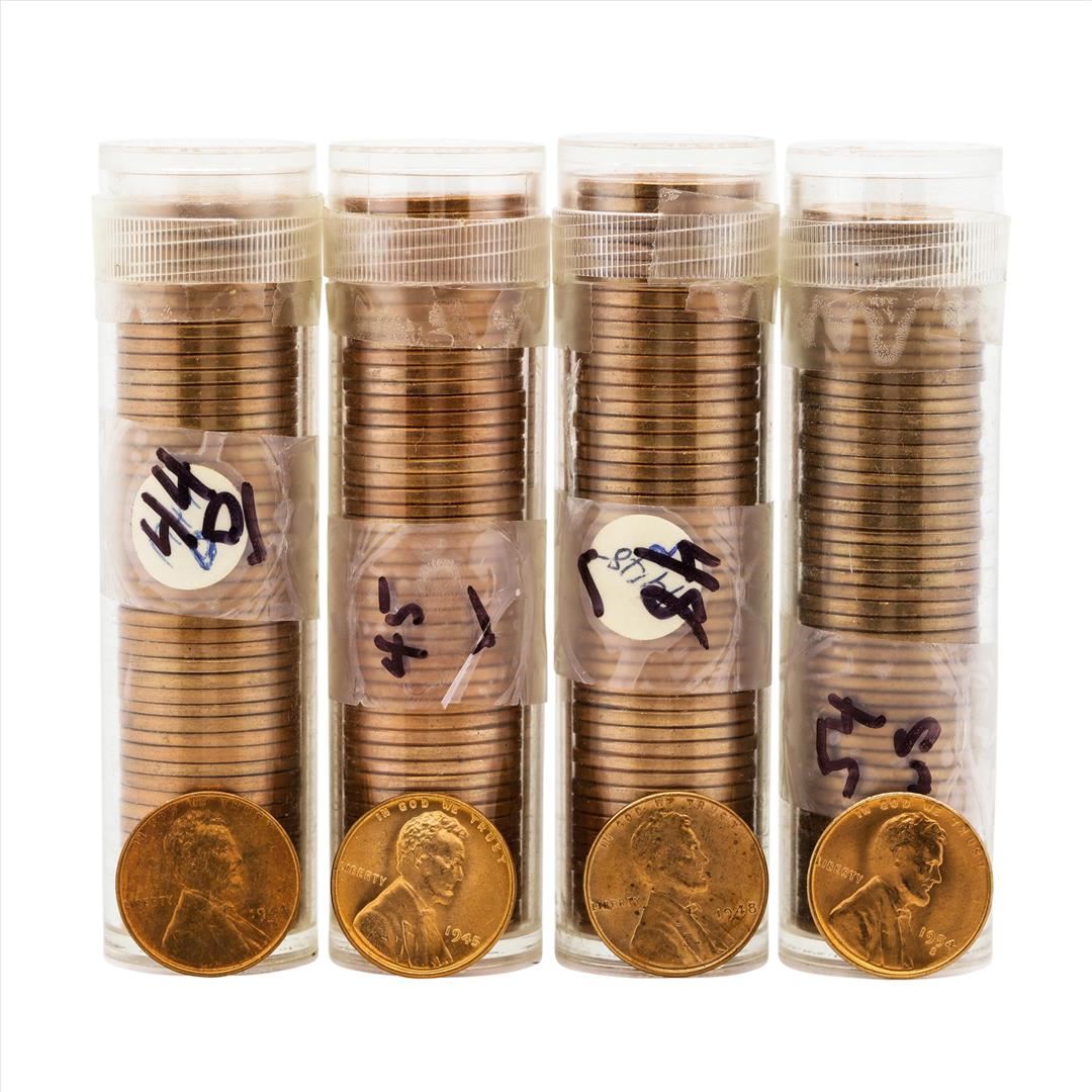 One Lot of (4) 1944-D, 1945, 1948, 1954-S Brilliant Uncirculated Lincoln Wheat Penny Rolls.
